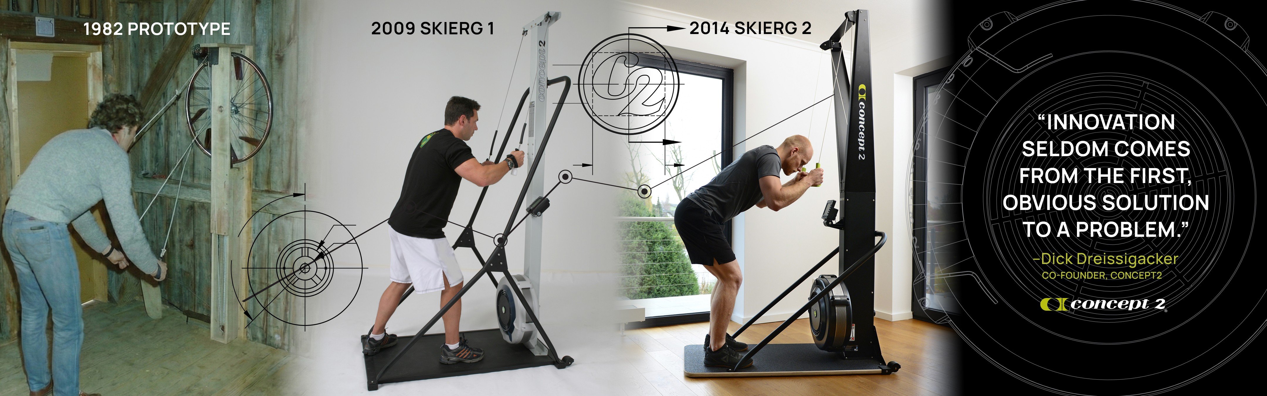 Når Concept2 utvikler produktideer og produkter, så er målet alltid å innovere og skape originale, unike produkter. Den første prototypen av Concept2 SkiErg kom for mer enn 40 år siden! Selv tidlig på 1980-tallet tenkte brødrene Peter og Dick Dreissigacker på andre måter å bruke svinghjulet fra Model A RowErg på. Romarkedet var lite, og Model A RowErg ble hovedsakelig bare solgt til roere. Siden de bodde i Nord-Vermont, var et ergometer for langrenn en naturlig tanke. Med noen få spiker og en Model A ble den første SkiErg-prototypen født.